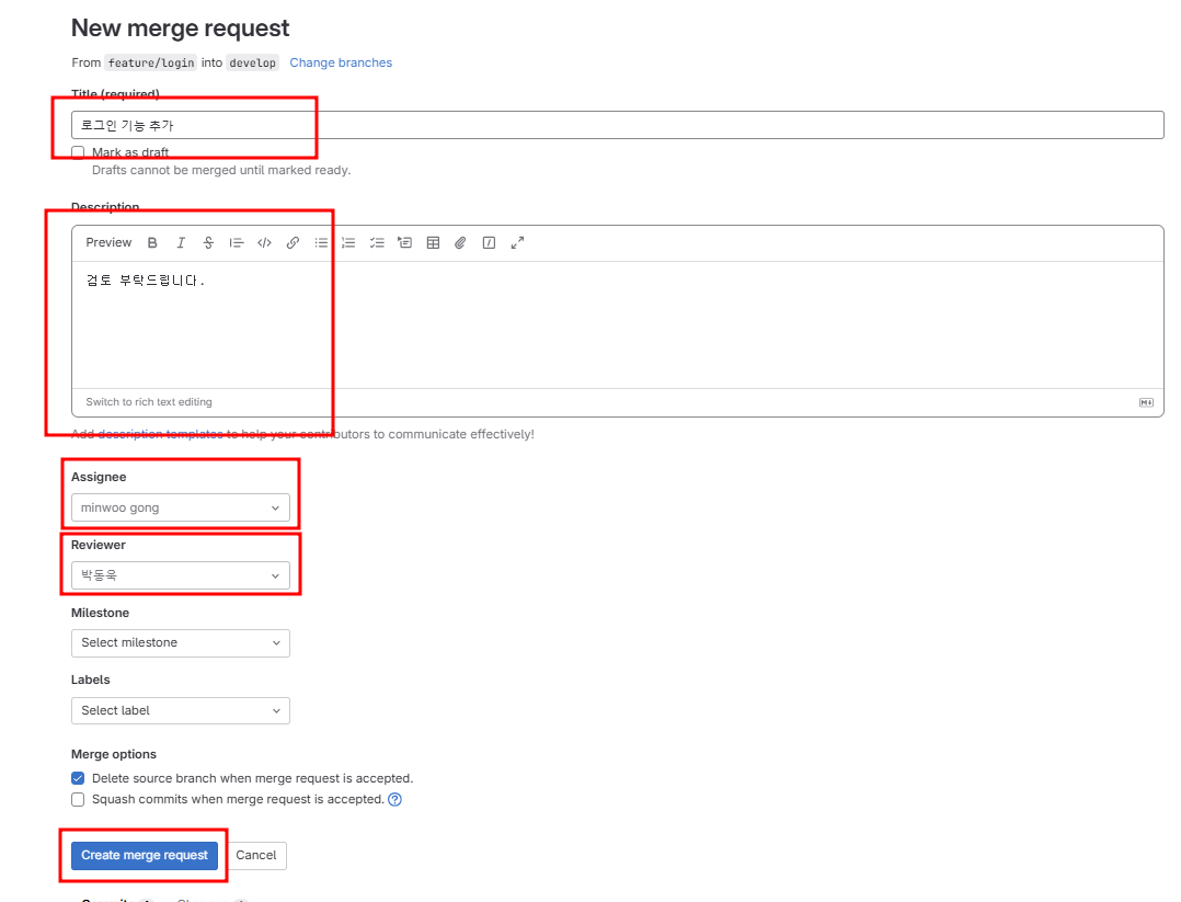 - feature 브랜치 : 새로운 기능 개발을 위해 dev 브랜치에서 분기하여 작업 후 다시 dev에 병합.